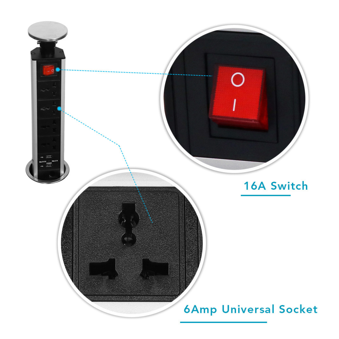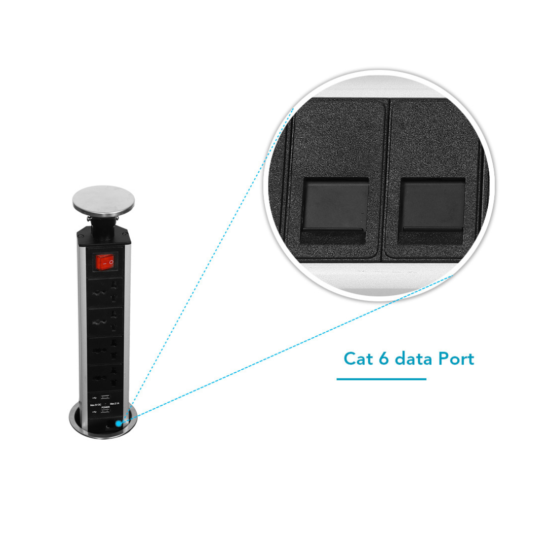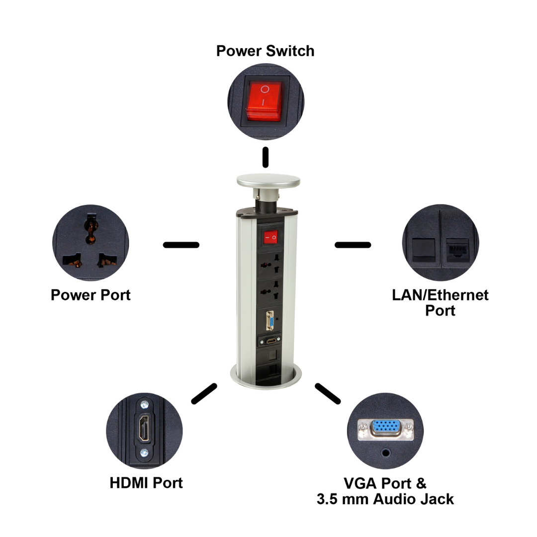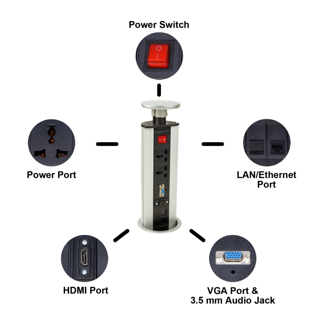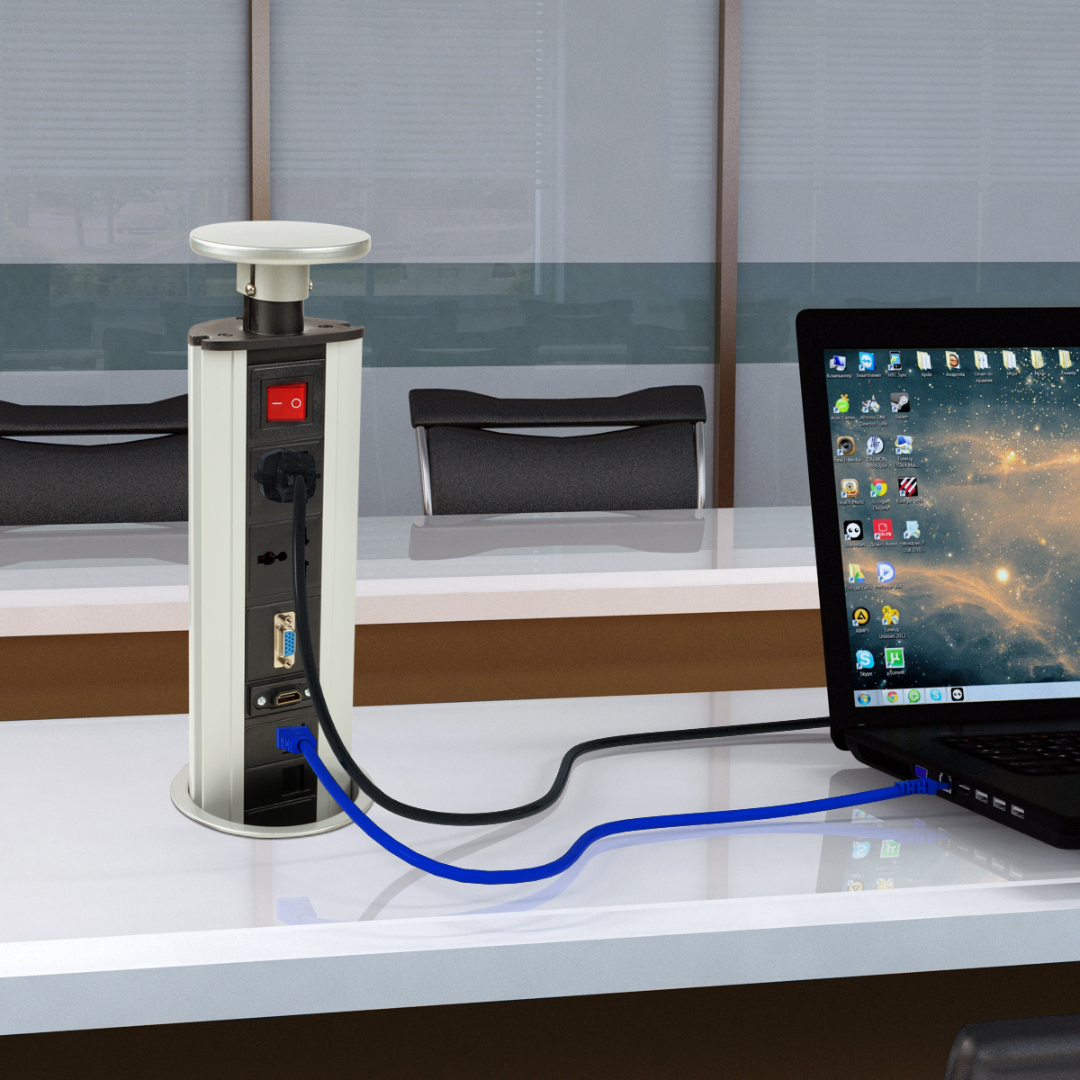 - Pull when you need — Vertical lift-up brings Socket, DATA, and AV Access to eye level